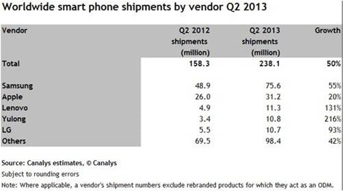 Canalys發(fā)布的報告顯示,今年第二季度,三星和蘋果智能手機(jī)出貨量的同比增幅分別達(dá)到55%和20%,占據(jù)出貨量排名前兩位;而聯(lián)想、宇龍和LG則分列三到五位。第二季度,中國排名前五的智能手機(jī)生產(chǎn)商(聯(lián)想、宇龍酷派、華為、中興和小米)在今年第二季度的出貨量占到了全球總出貨量的20%,去年同期該份額不足15%。