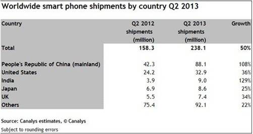 北京時間8月6日消息,據(jù)國外媒體報道,全球著名市場研究機(jī)構(gòu)Canalys周一公布了今年第二季度全球智能手機(jī)出貨量調(diào)查報告。報告顯示,今年第二季度,全球智能手機(jī)出貨量約為2.381億部,同比增幅達(dá)到驚人的50%。中國市場的手機(jī)銷量目前已占全球手機(jī)銷量的20%,這主要得益于中國大批量生產(chǎn)的低價智能手機(jī)銷量的猛增。