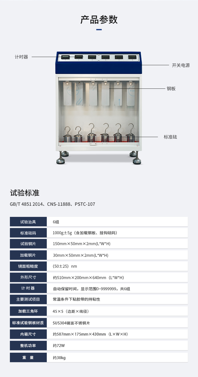 該儀器測試方法是將膠帶粘于測試鋼片上,下端懸掛標(biāo)準(zhǔn)荷重,經(jīng)過一段時(shí)間后,測量膠帶下滑距離或膠帶粘著時(shí)間用來評定膠帶粘著的持久性。