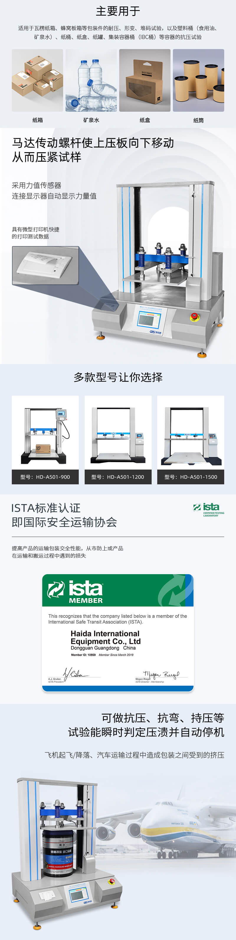 該產(chǎn)品適用于瓦楞紙箱、蜂窩板箱等包裝件的耐壓、堆碼試驗,以及塑料桶(食用油、礦泉水)、紙桶、紙盒、紙罐、集裝容器桶(IBC桶)等容器的抗壓試驗(如果需要測定試驗樣品在堆碼過程中受外界壓力載荷時的耐壓能力,建議使用此機臺進行試驗)。
