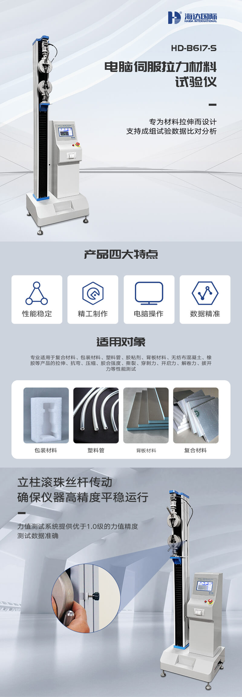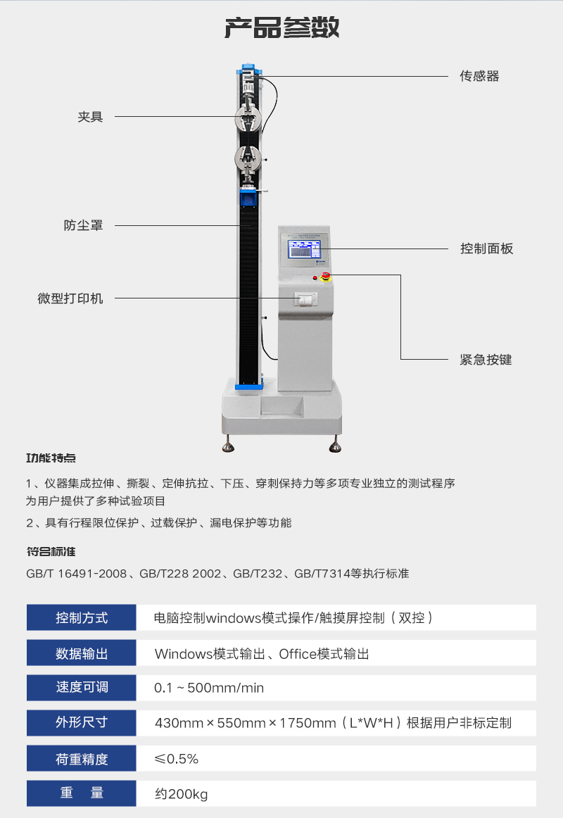 電線電纜拉力機(jī)適用于復(fù)合材料、包裝材料、塑料管、膠粘劑、背板材料、無(wú)紡布、混凝土、橡膠等非金屬材料和醫(yī)療器械、線纜、鋼材等金屬產(chǎn)品的拉伸、抗彎、壓縮、膠合強(qiáng)度、撕裂、穿刺力、開(kāi)啟力、解卷力、拔開(kāi)力等性能測(cè)試。
