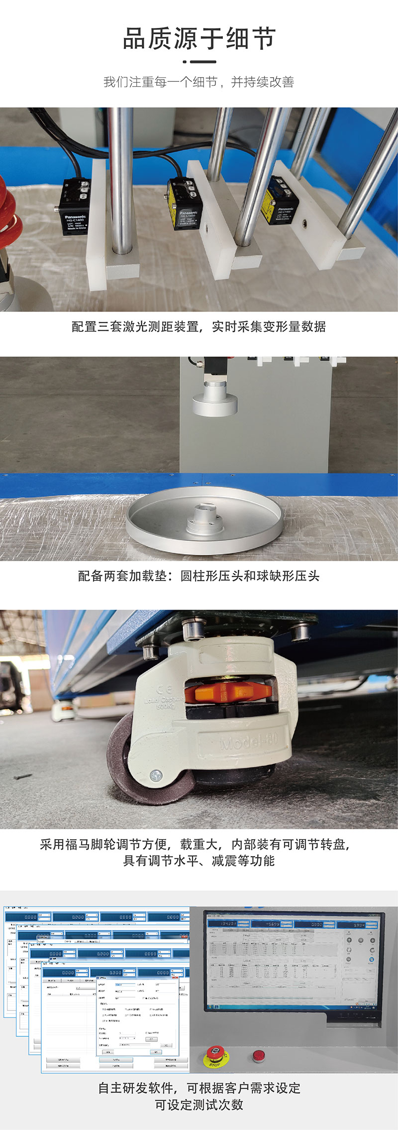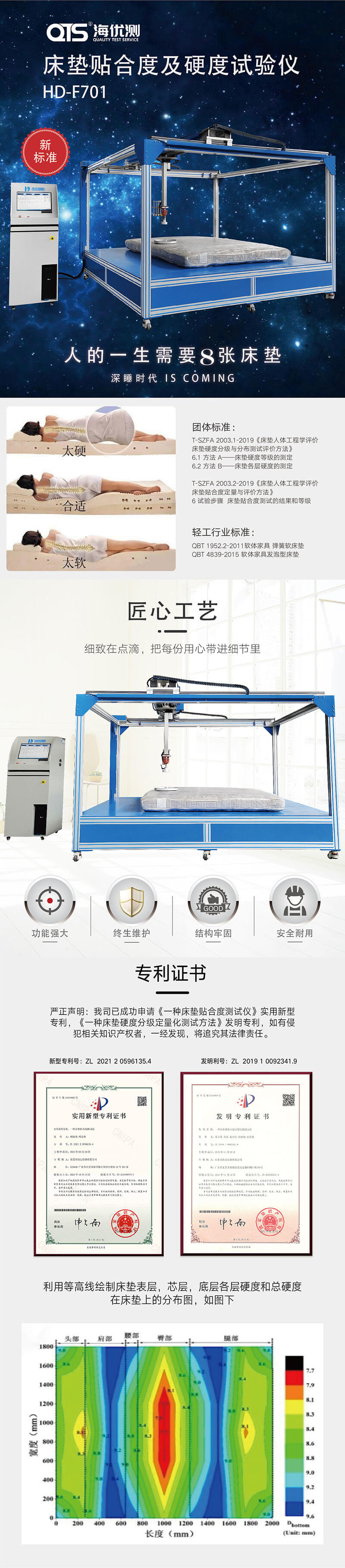 床墊貼合度綜合試驗(yàn)機(jī)用于對(duì)家庭、酒店、旅館、飯店等場合使用的彈簧軟床墊和發(fā)泡型床墊進(jìn)行出廠成品檢測,對(duì)床墊硬度和滯后損失率及貼合度進(jìn)行測試,測試完成后根據(jù)測試評(píng)定試樣的等級(jí)。